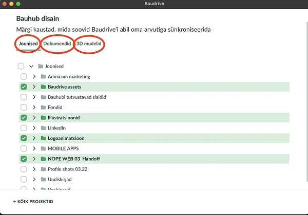 2.3 Kaustade valimiseks vajuta projektide nimekirjas soovitud projekti peale. Iga projekti failid on jagatud jooniste ja dokumentide vahelehtedele, mille vahendusel saad linnukestega märkida täpselt need kaustad, mida enda arvutiga sünkroniseerida soovid.