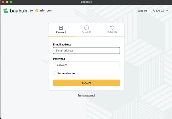 2.1 Installeerimise järel käivita Baudrive’i rakendus, mille avamisel kuvatakse sisselogimisaken. Logi sisse oma Bauhubi kasutajakontoga, valides endale sobiva autentimisviisi.