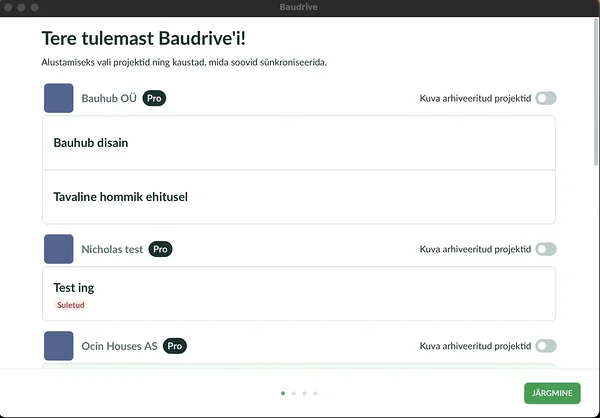 Valikute tegemise järgselt vajuta akna alumises ääres nupule "Kõik projektid", mis viib su tagasi projektide vaatesse. Seejärel teeb esmakordse kasutuse korral Baudrive lühikese ülevaate sellest, kuidas rakendus toimib.