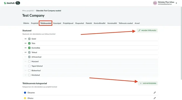 Projekti administraatoritel on võimalik kategooriaid ka muuta ja lisada (maksimaalselt 10tk), muutmaks seeläbi töölaua juhtimise vastavaks ettevõtte või projekti spetsiifikale ning vajadustele. Töövõtuliikide kajastamine — nt elektritööd, betoonitööd — kategooriate abil ei ole kõige kasulikum, kuna tavapäraselt on töölauad juba ise töövõtu- või ettevõttepõhised (nt on elektritöid teostatav ettevõte lisatud ühe osapoolena ning talle on loodud enda töölaud).