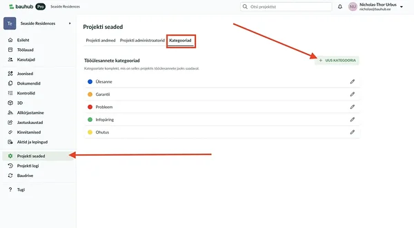 Kategooriate muutmiseks tuleb avada vasakult menüüst "Projekti seaded" ja vajutada vaheleht "Kategooriad" ja avanenud vaatest näed rohelist nuppu " + Uus kategooria".