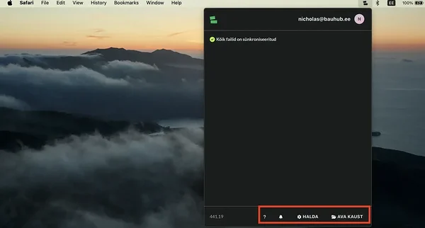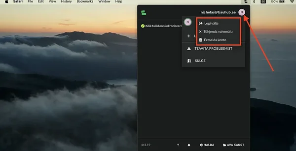 Parempoolsest ülemisest nurgast leiad enda kasutaja e-maili aadressi ja eesnime tähega nupu, millele vajutamine kuvab sinu Baudrive kasutajaid ning võimaluse uusi lisada. Kasutaja nimele järgnevale kolme punktiga ikoonile vajutamine avab rippmenüü järgmiste võimalustega: